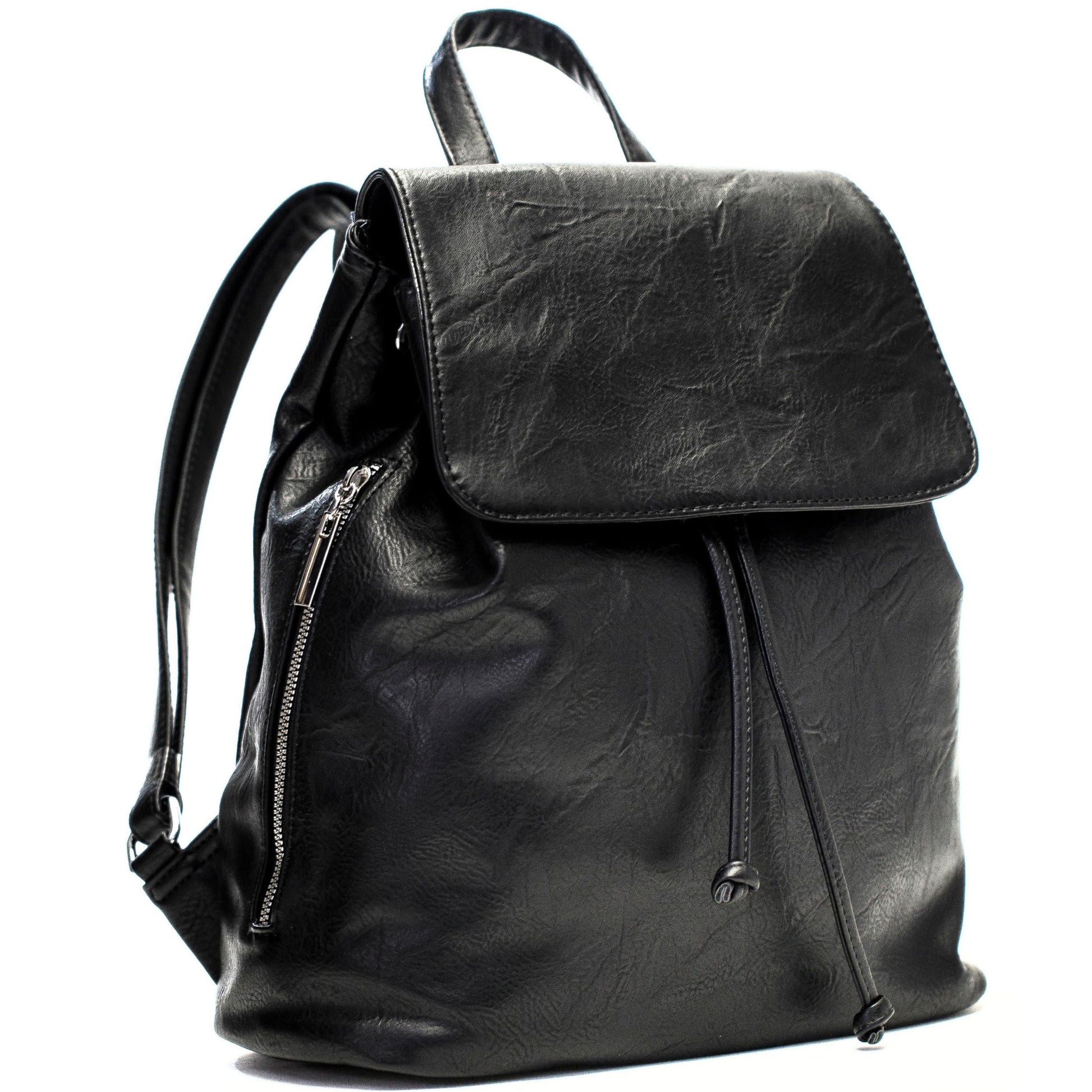 Jude - Stylish Faux Leather Flap Top Backpack with Drawstring & Zip Pockets