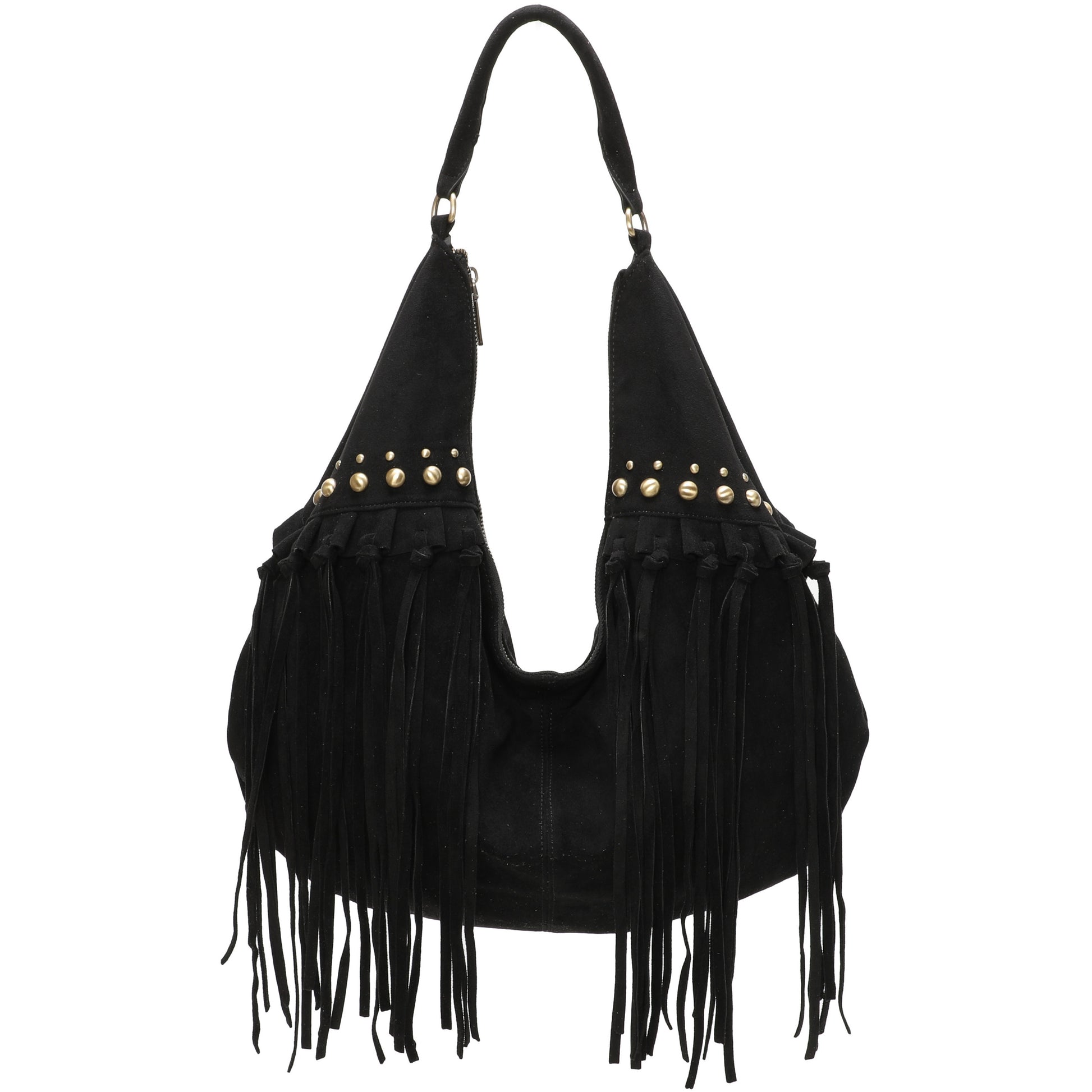 - ✨ Western Fringe Styling Soft faux suede hobo shoulder bag with long swinging fringe and antique gold stud detail – the Meg is pure cowgirl / festival / boho energy, day or night.
